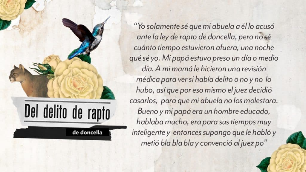 “Hay historias que parecieran de otros tiempos, historias de amor que parten con un rapto, historias de amor que también se rompen en dos, entre secretos y engaños… algo tuvo que ver aquí la famosa “sucursal”.
